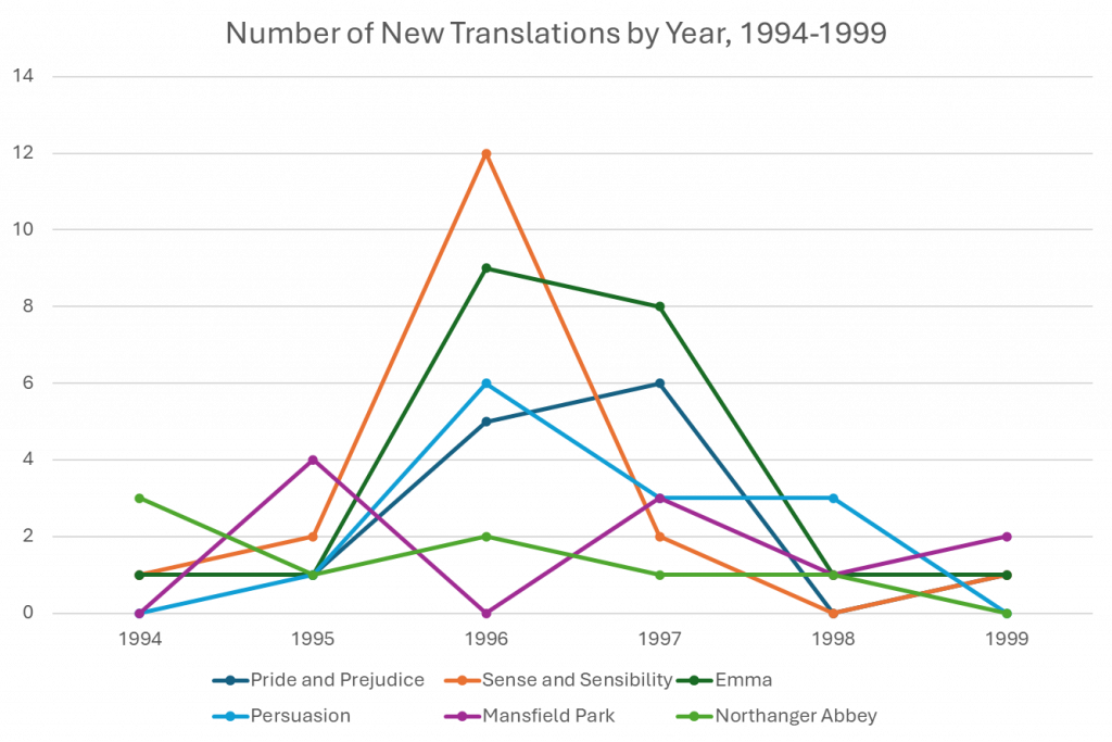 This chart maps the number of translations for each novel, both new and reissued, each year from 1994-1999. Immediately obvious is the large peak in 1996, not just for Sense and Sensibility but for most of the other novels as well. So how to explain this?